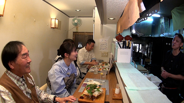 今宵の舞台は、東京都荒川区西尾久(にしおぐ)。東京さくらトラム(都電荒川線)小台(おだい)停留場から、きたろうさんと武藤さんが向かったのは、旬の食材にこだわった絶品料理が味わえる人気酒場「旬菜 あかり」。清潔感あふれる明るい店内で、ご主人の槙島一嘉(まきしま かずよし)さん(56歳)に迎えられ、さっそく、ふたりは、焼酎ハイボールで「今宵に乾杯!」