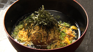 続いては、創作料理「蓮根饅頭のカラスミあんかけ」を。お椀の蓋を開けると、出汁の香りがたちのぼり、蓮根饅頭の上にはすりおろした自家製カラスミがたっぷり! 「カラスミの塩味がいいと思います」と言うご主人の言葉を、そのまま繰り返すばかりのきたろうさん。とにかく美味しすぎる一品に、思わずため息をもらすのだった。