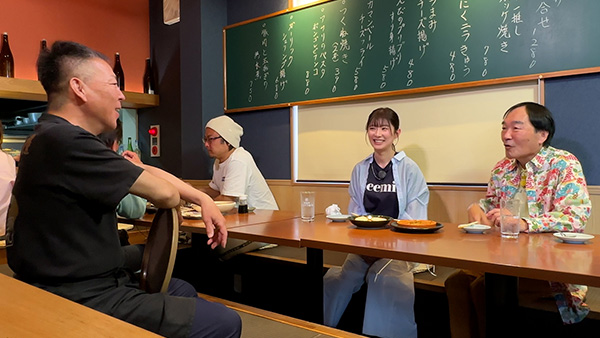 今宵の舞台は、東京都葛飾区四つ木。漫画「キャプテン翼」の作者・高橋陽一氏の出身地であり、漫画の主人公・大空翼の銅像が設置された公園や、「キャプテン翼」のラッピング装飾が施された京成電鉄押上線・四ツ木駅など、ファンにとって見どころの多いエリアだ。そんな四つ木で、きたろうさんと武藤さんが訪れたのは、和食をベースにした様々な創作料理が味わえる「呑み食い屋 わ」。広々とした清潔感のある店内で、ご主人の鈴木康史さん(55歳)に迎えられ、ふたりは、さっそく、焼酎ハイボールで「今宵に乾杯!」