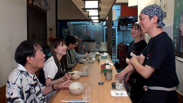 最初のおすすめは、名物「すごいうずら串」と「紅のつくね」。「どのへんが、“すごい”の?」と不思議そうな武藤さん。きたろうさんは、「うずらの卵なんて大しておいしくないだろ!?」とつぶやきながら口に運ぶと、その瞬間、「うんまっ!!」と目を見開き、「半熟のうずら卵を焼いてあるんだ! すばらしい!」と絶賛。武藤さんも、「みんなが求める半熟卵。トロっととろける〜」とうっとりだ。「紅のつくね」は、つくねに刻んだ紅生姜を混ぜてあり、お好みでマヨネーズをつけていただく。「マヨネーズが異常に合う!」と、こちらも気に入った様子のきたろうさん。ご主人は「ちょっとタコ焼き感が出ますよね」と笑いながら、「常連さんから紅生姜のかき揚げを毎日リクエストされたのがきっかけで、考案したんです」と教えてくれた。