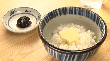 最後の〆は、温かいご飯にバターを一片のせた「バターごはん」! 海苔の佃煮を醤油がわりに一緒にいただく。きたろうさんは、「驚いた! ただのバターごはんだ」と大興奮! 一口食して、「想像を超えないよ(笑)」と言いながらもうれしそう! 「私、食べたことないんですよね」という武藤さんも「おいしい〜。贅沢なごはんって感じになりますね」と自然と笑顔がこぼれた。