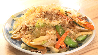 最後の〆は「焼うどん」。豚バラ肉、人参、絹さや、キャベツと具沢山で食べ応えもたっぷり! 味の決め手は女将が手作りする自家製のだし醤油だそうで、「味付けが旨いよ〜」ときたろうさん。武藤さんは「調味料からこうやって手間をかけるとおいしいものができるんですね」と感心しきりであった。