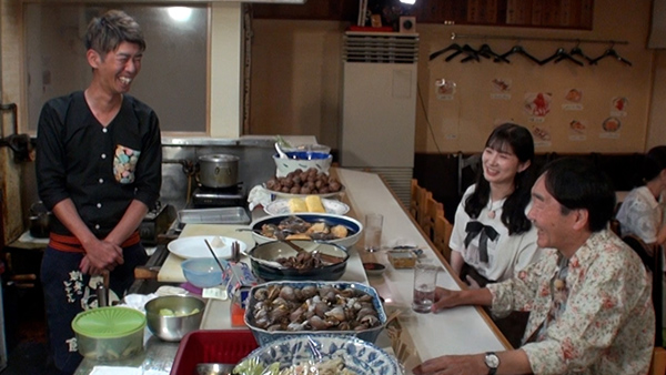 ここで、常連さんたちに店の魅力を聞いてみると、「いつでも同じテンションで受け入れてくれる」、「ゆったりと心が落ち着く。構えなくても家と同じように飲める」、「名物料理もいろいろあって、おいしいしリーズナブル」と口々に絶賛だ。そんな常連さんのひとりは、奥さんがこの店の従業員! 店で出会って2年前に結婚したそうで、ご主人によると、店で出会って結婚した3組目のカップルだとか! これには武藤さんも、「私もここに来たら誰か……!?」と目を輝かせた。