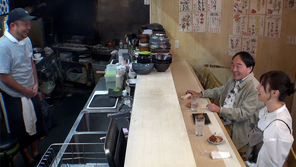 今宵の舞台は東京都墨田区曳舟(ひきふね)。古い長屋などが残る下町情緒あふれる街で、きたろうさんと武藤さんが訪れたのは、創業16年目を迎えた「大衆居酒屋 よね屋」。にこやかに迎えてくれたご主人の米山大輝さん(38歳)に、ふたりはさっそく焼酎ハイボールを注文して、常連さんたちと一緒に「今宵に乾杯!」